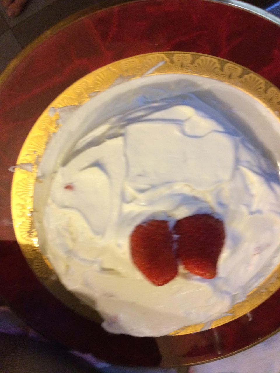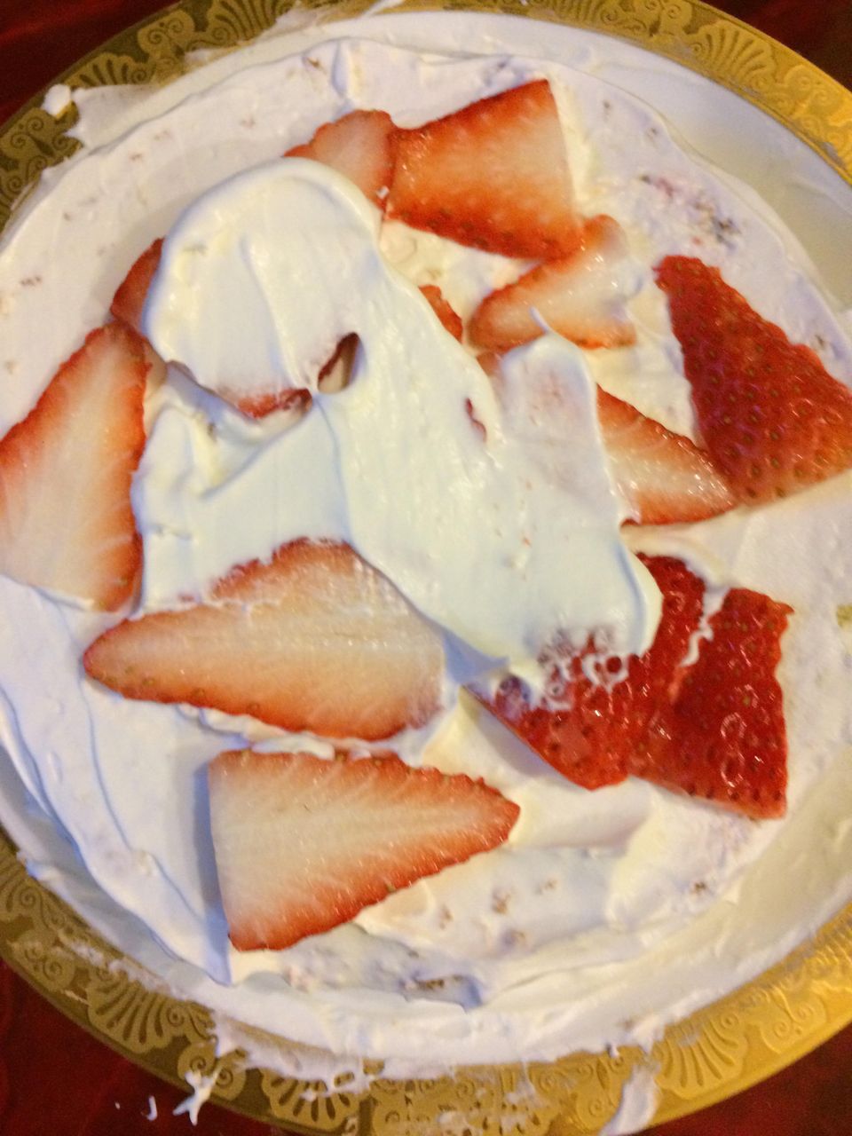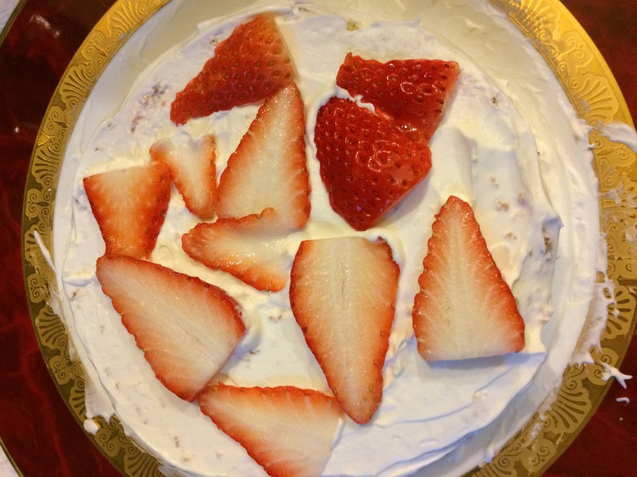 飽きたら半分とかに切ってクリームとイチゴ挟んで上乗っけて周りにまたクリーム塗りたくって苺デーンと乗っけると完成。
