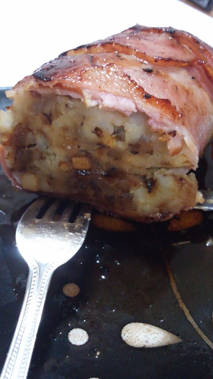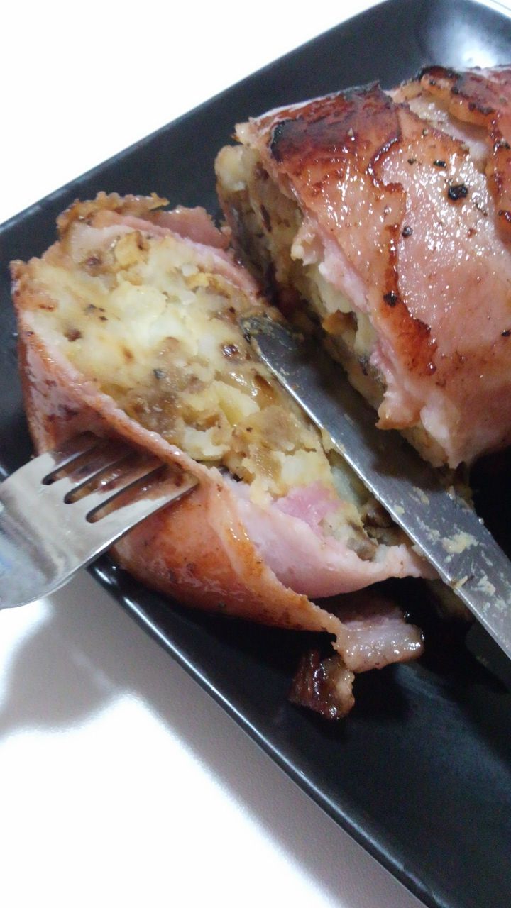 ・ジャガイモが蒸しあがったら皮を剥いて、炒めた具と混ぜて練り込む