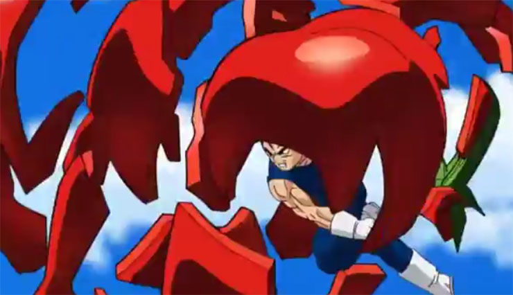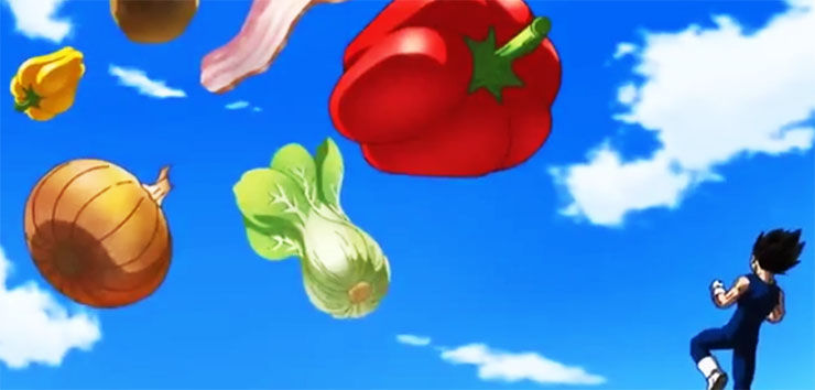 CM動画を観てみると、そこにはブチギレしたベジータが登場。空から降ってくるパプリカ、ジャガイモ、たまねぎ、チンゲン菜などを破壊していき、最後にブルマが落としたキャベツを破壊する。