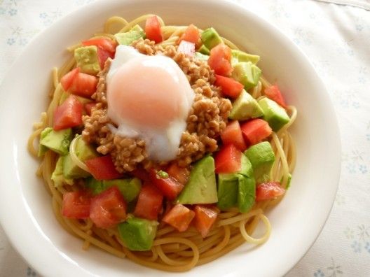 生卵と納豆と粉チーズと黒胡椒(できればミルで削って)を混ぜて、熱々のスパゲッティと混ぜる